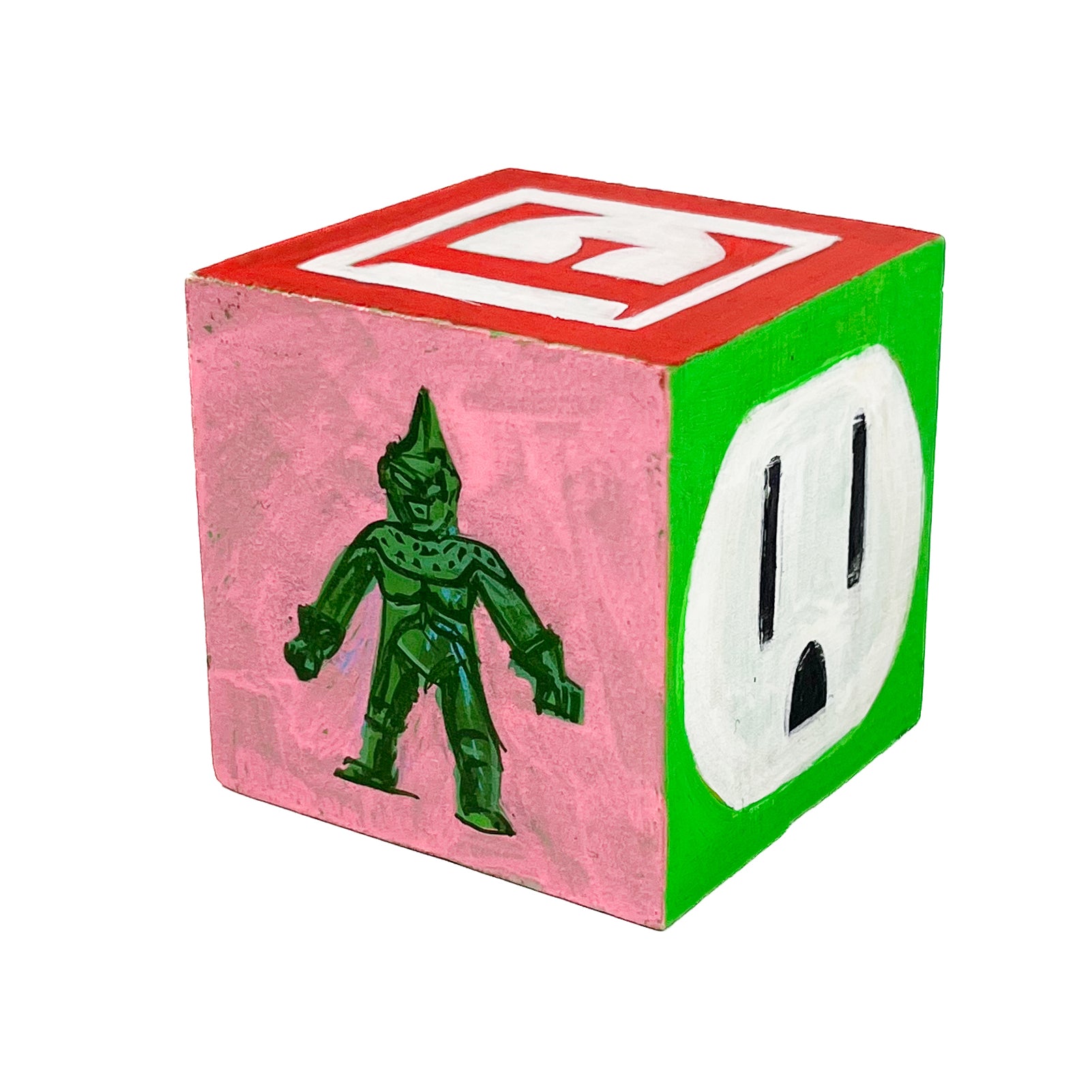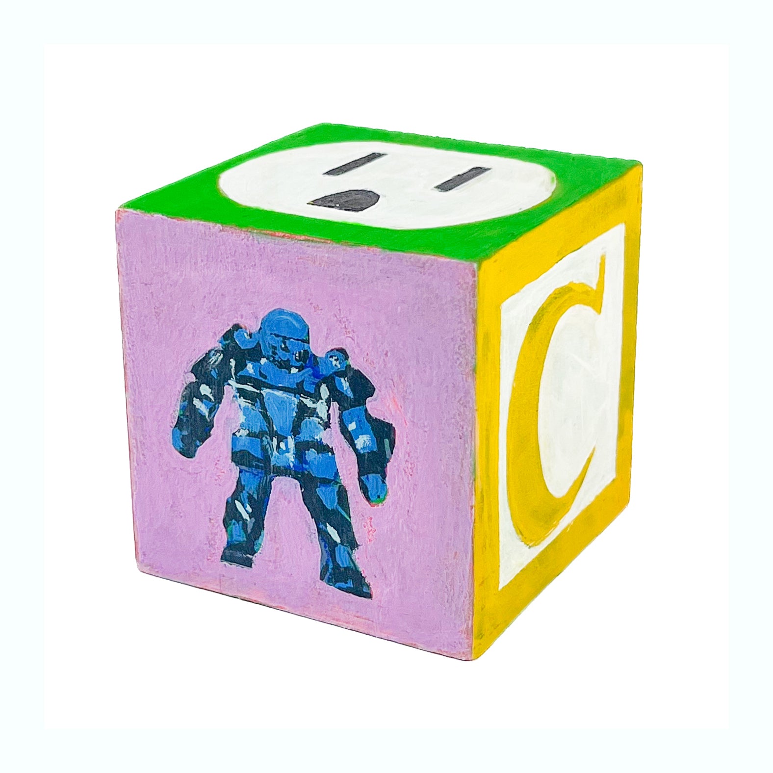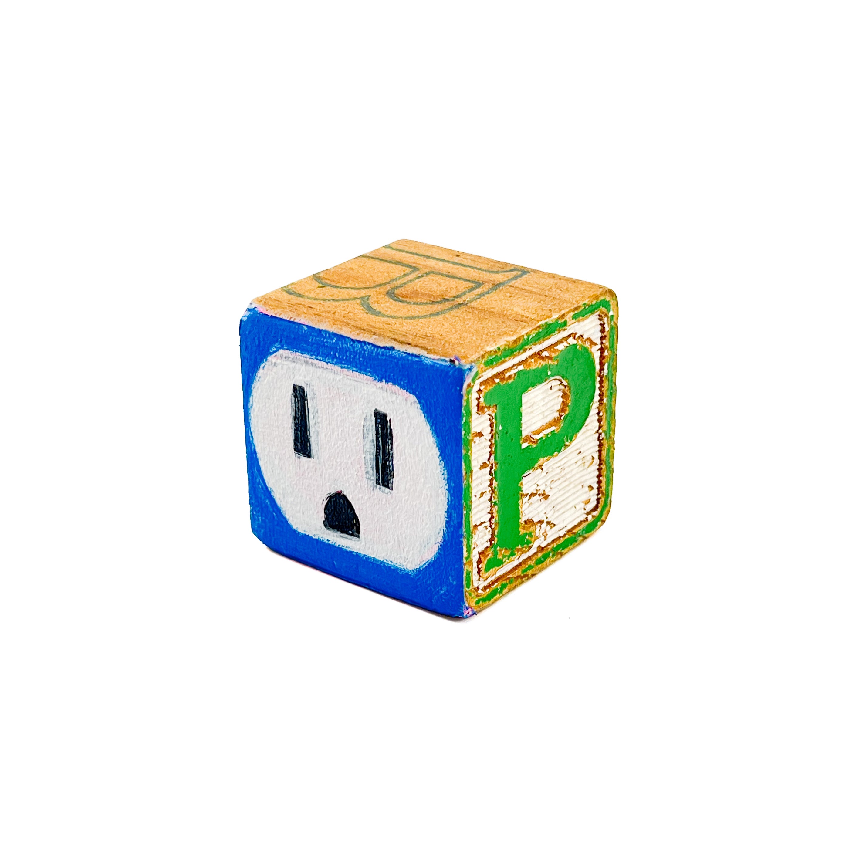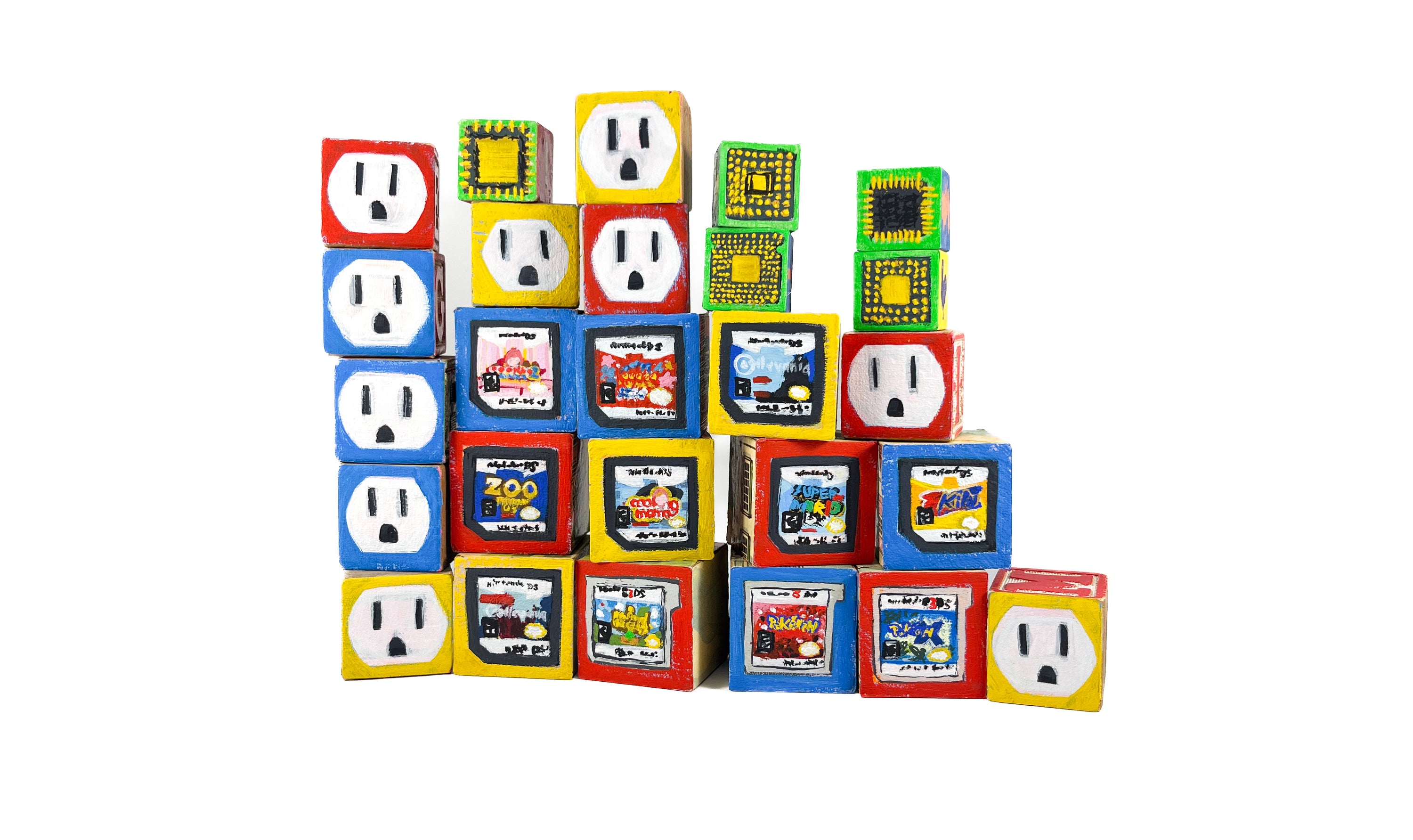 I found used ABC blocks from a thrift store and painted one side each to show at Tiny Gallery St. Johns in Portland, Oregon in February 2025. This first round of toy blocks have images of video game cartridges, power outlet faces, and various microchips. Modern toys are typically electronic, and it seems most kids would rather play with video games than these toy blocks they are shown on.