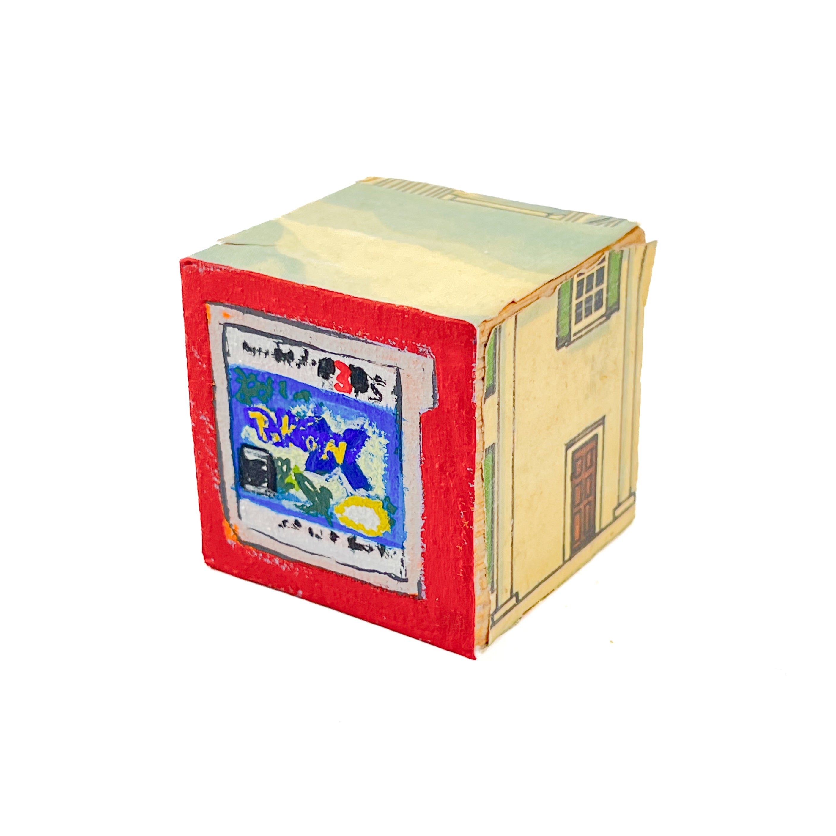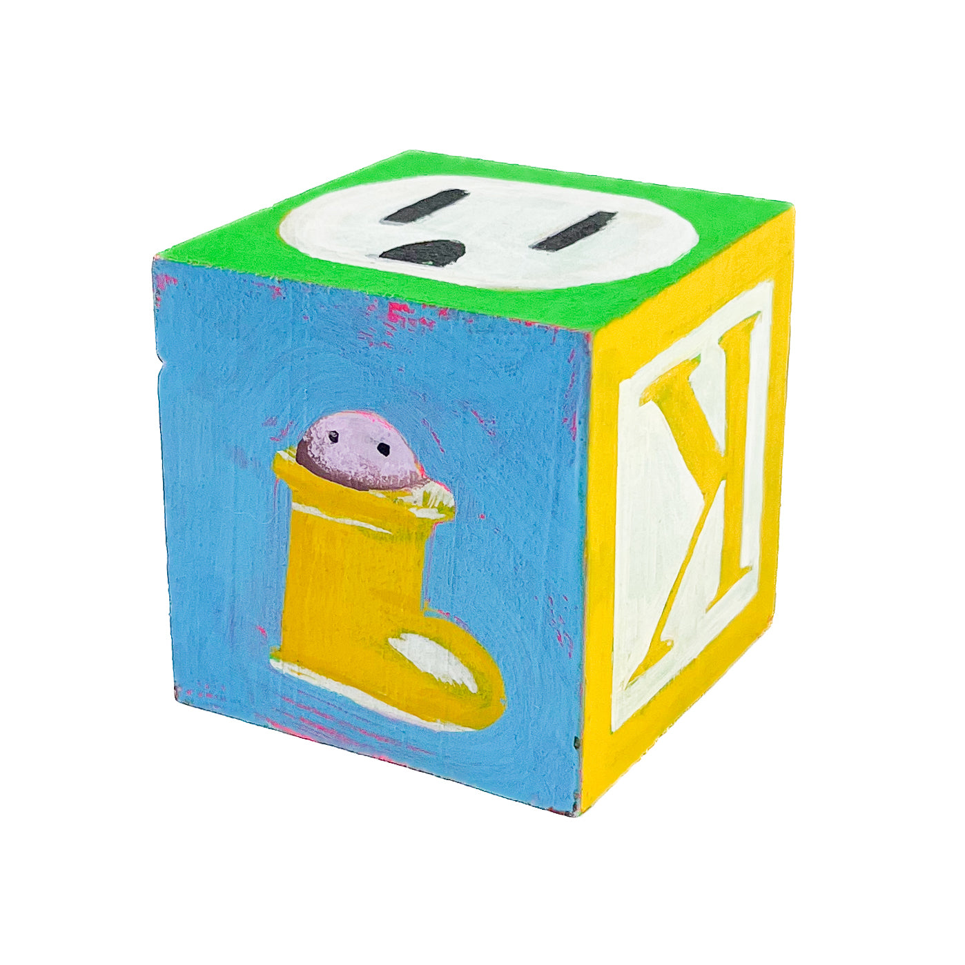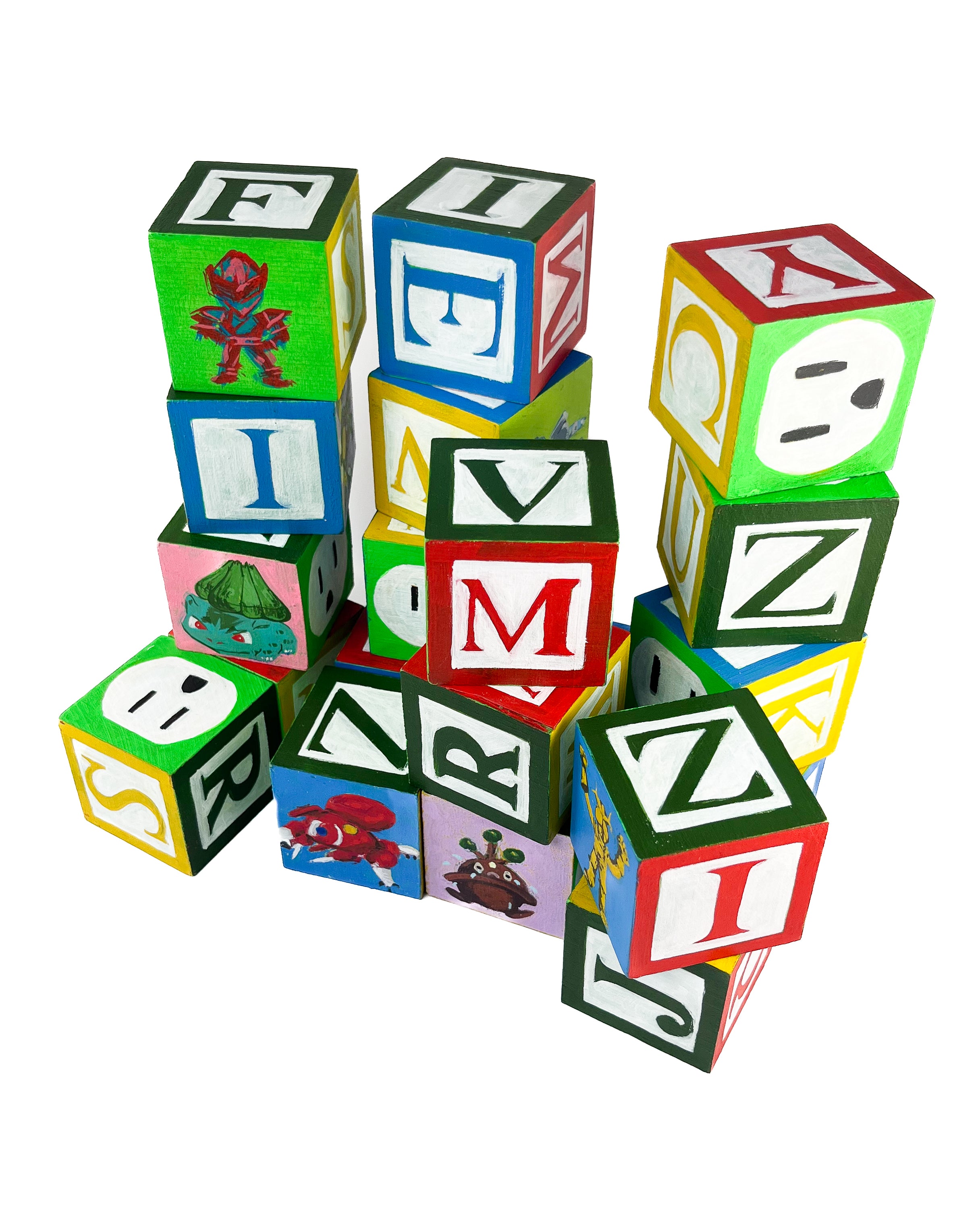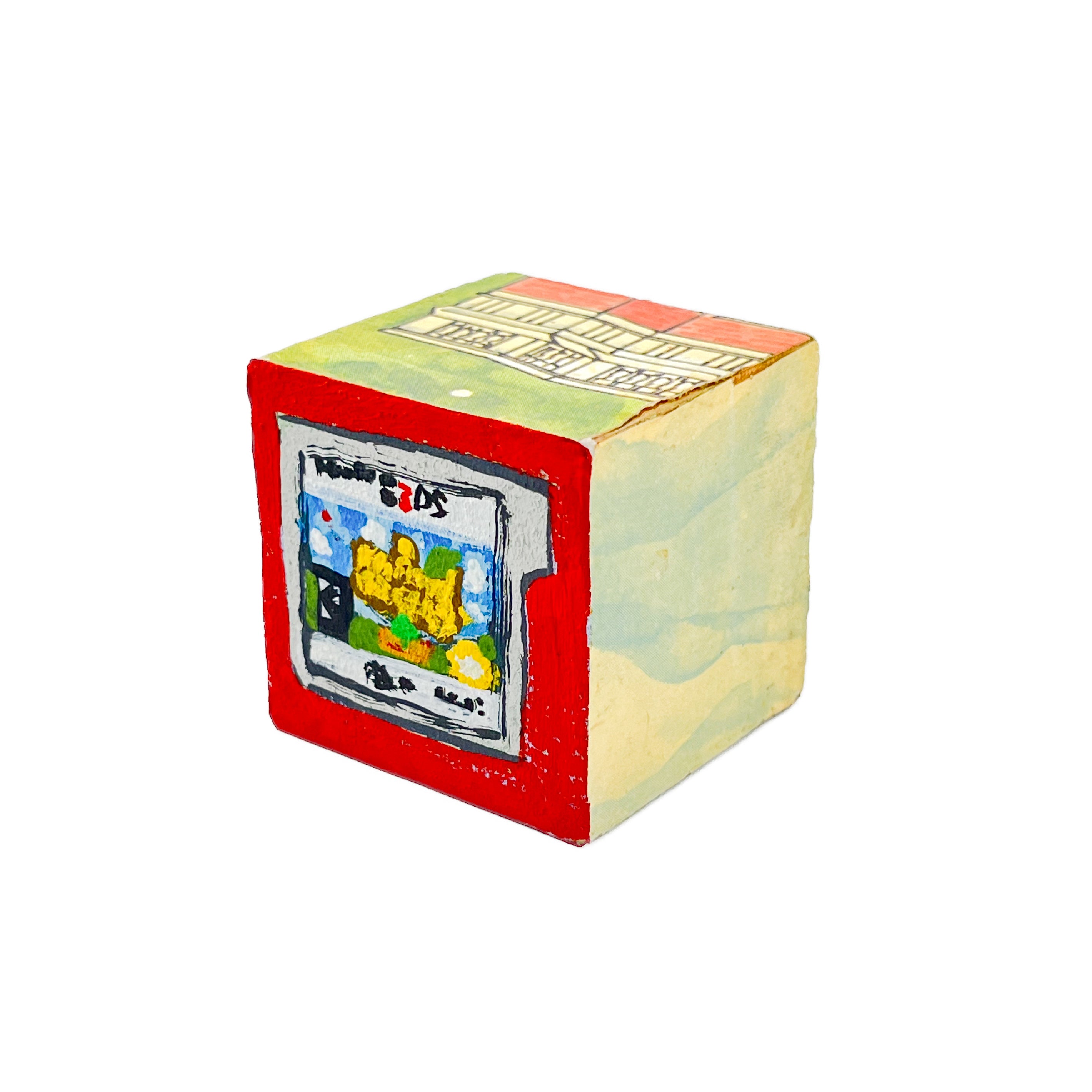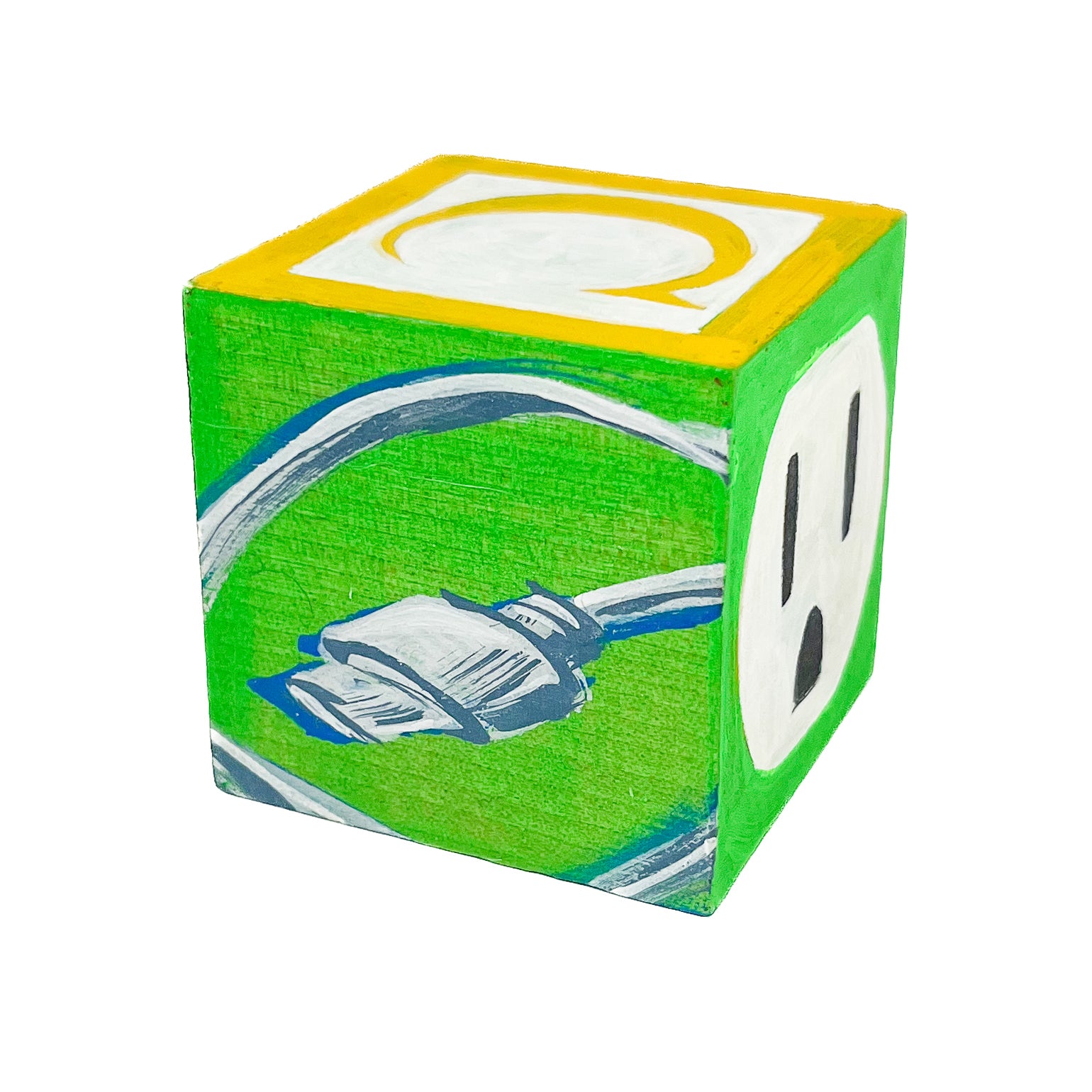 I found used ABC blocks from a thrift store and painted one side each to show at Tiny Gallery St. Johns in Portland, Oregon in February 2025. This first round of toy blocks have images of video game cartridges, power outlet faces, and various microchips. Modern toys are typically electronic, and it seems most kids would rather play with video games than these toy blocks they are shown on.