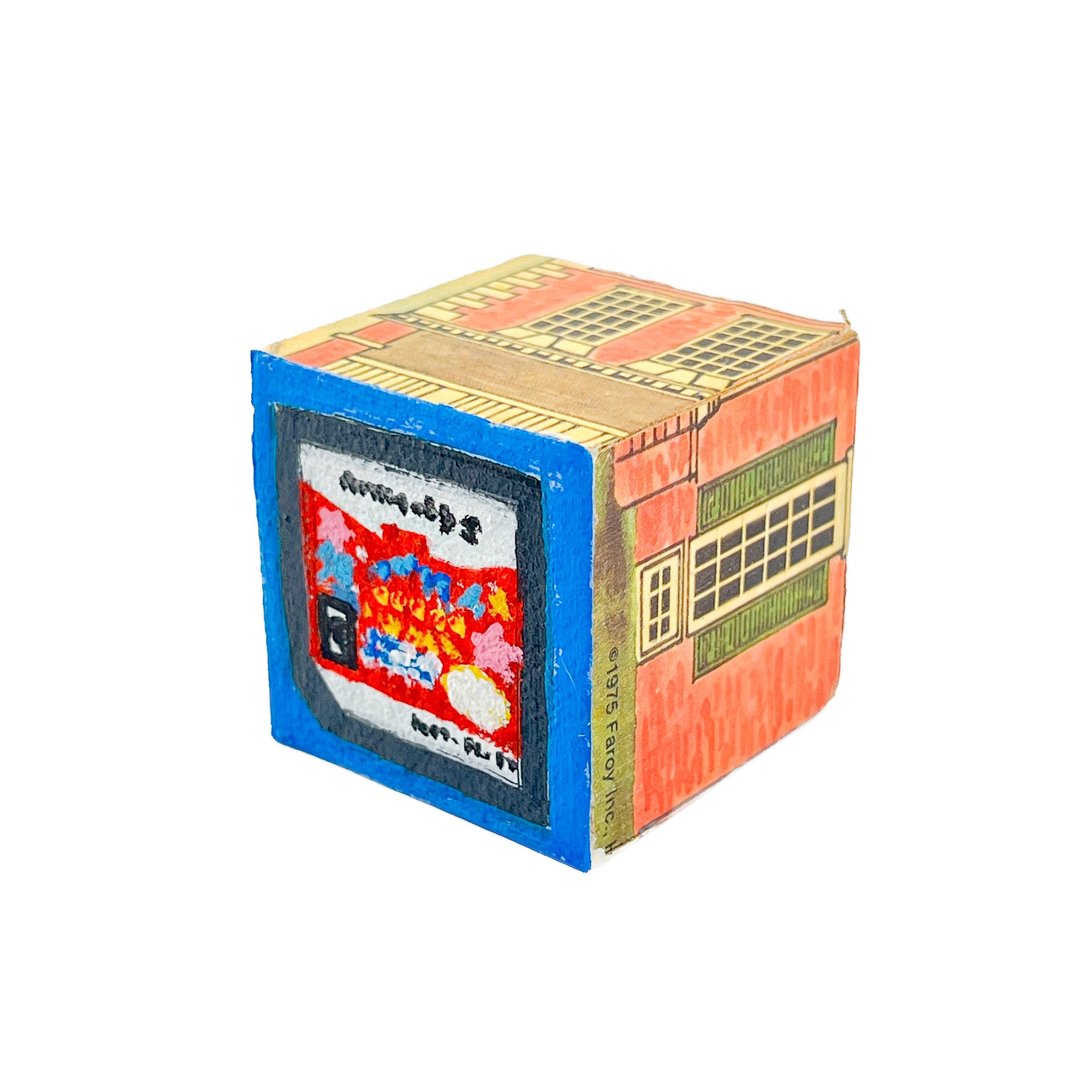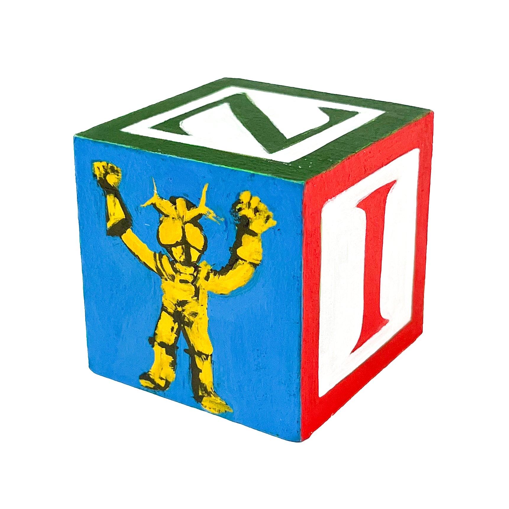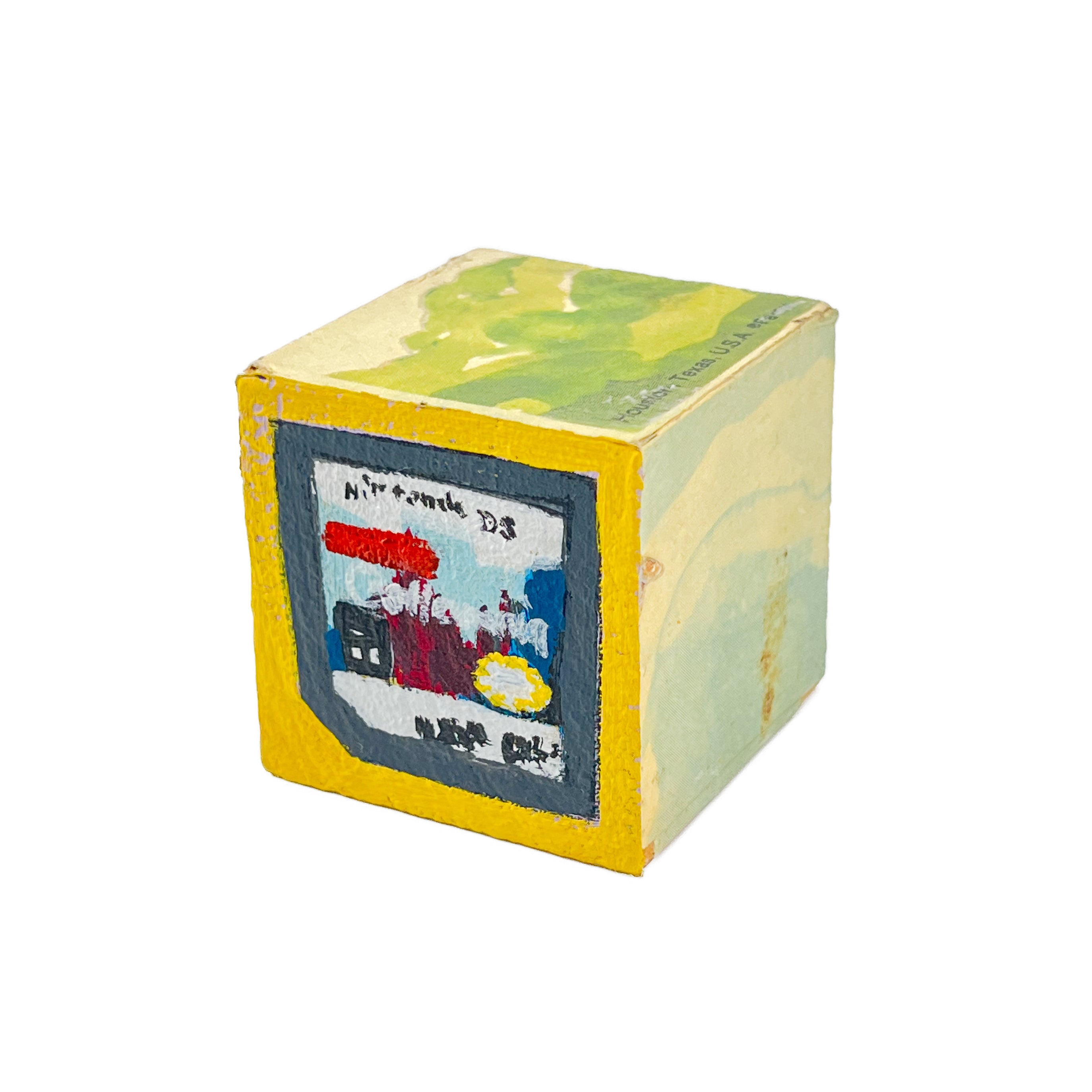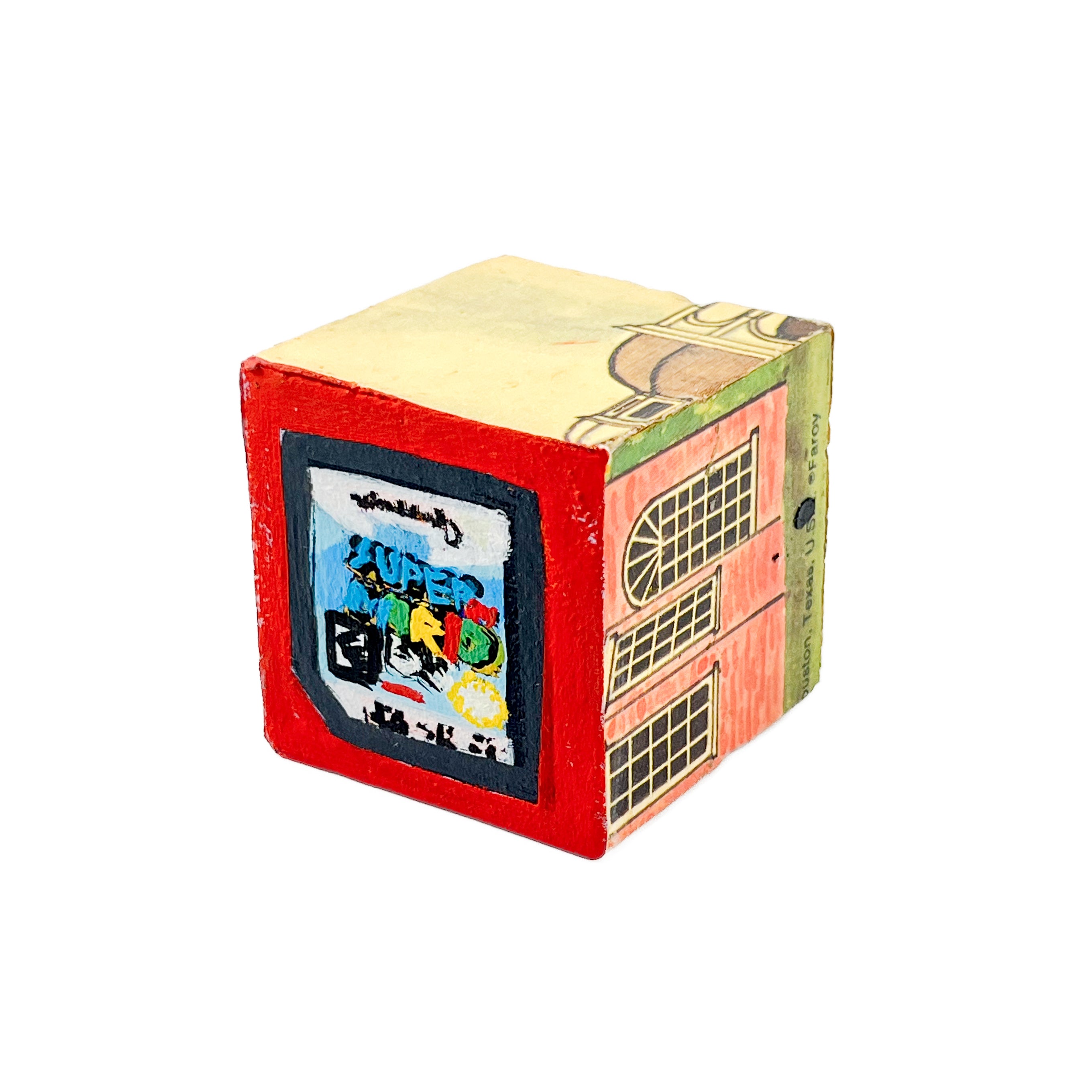 I found used ABC blocks from a thrift store and painted one side each to show at Tiny Gallery St. Johns in Portland, Oregon in February 2025. This first round of toy blocks have images of video game cartridges, power outlet faces, and various microchips. Modern toys are typically electronic, and it seems most kids would rather play with video games than these toy blocks they are shown on.