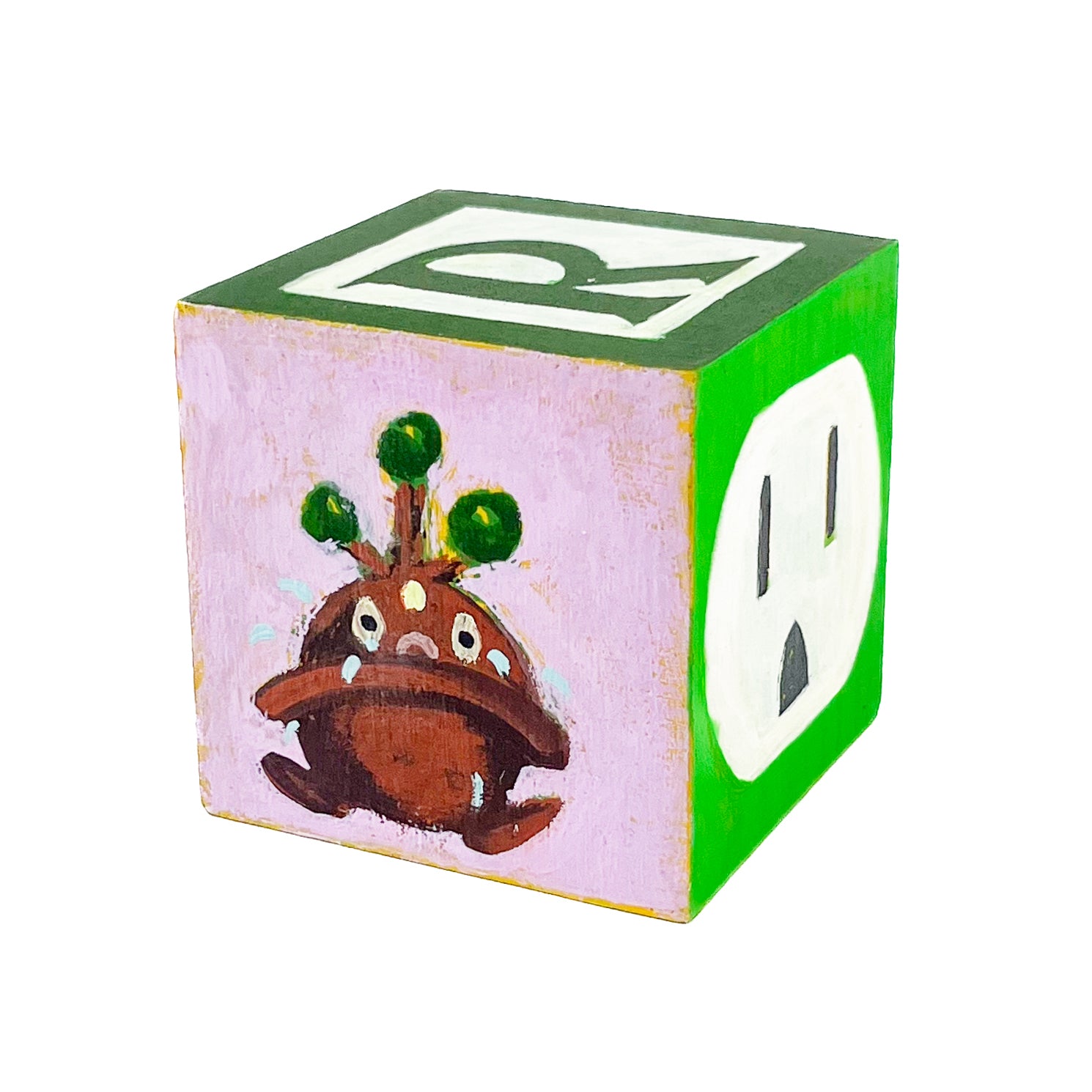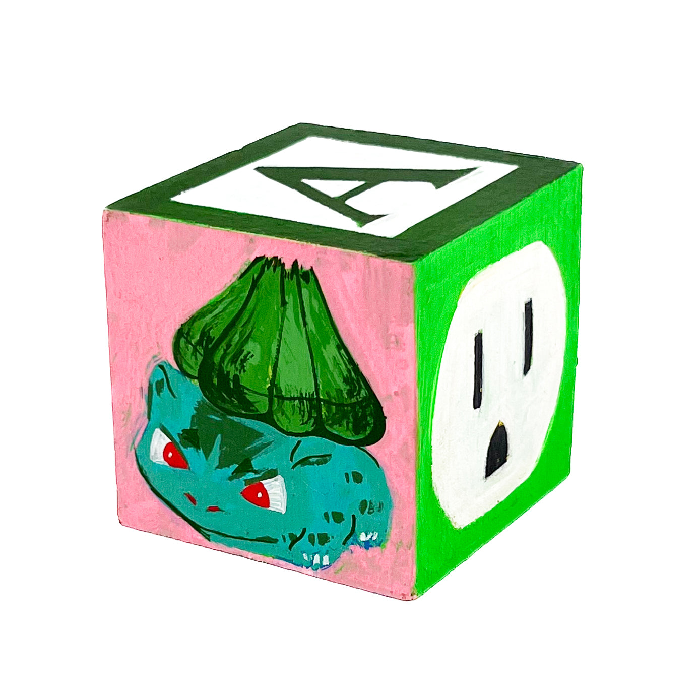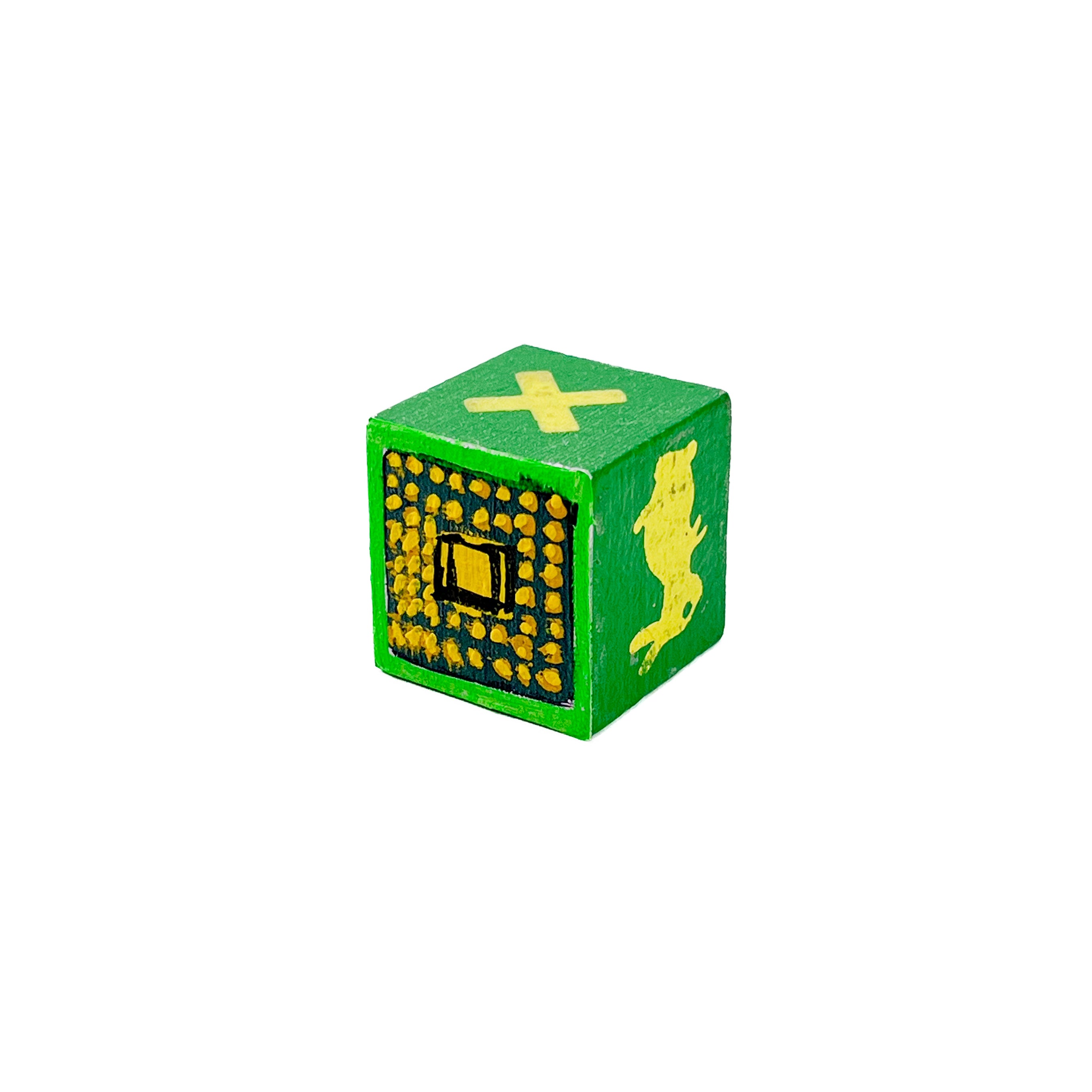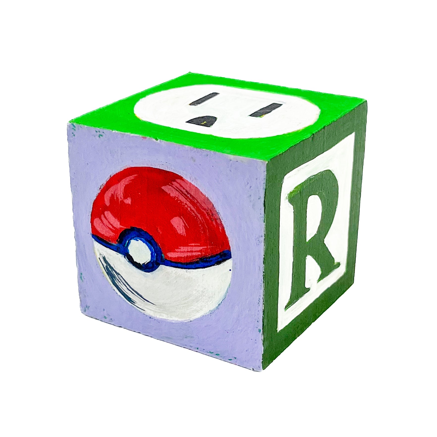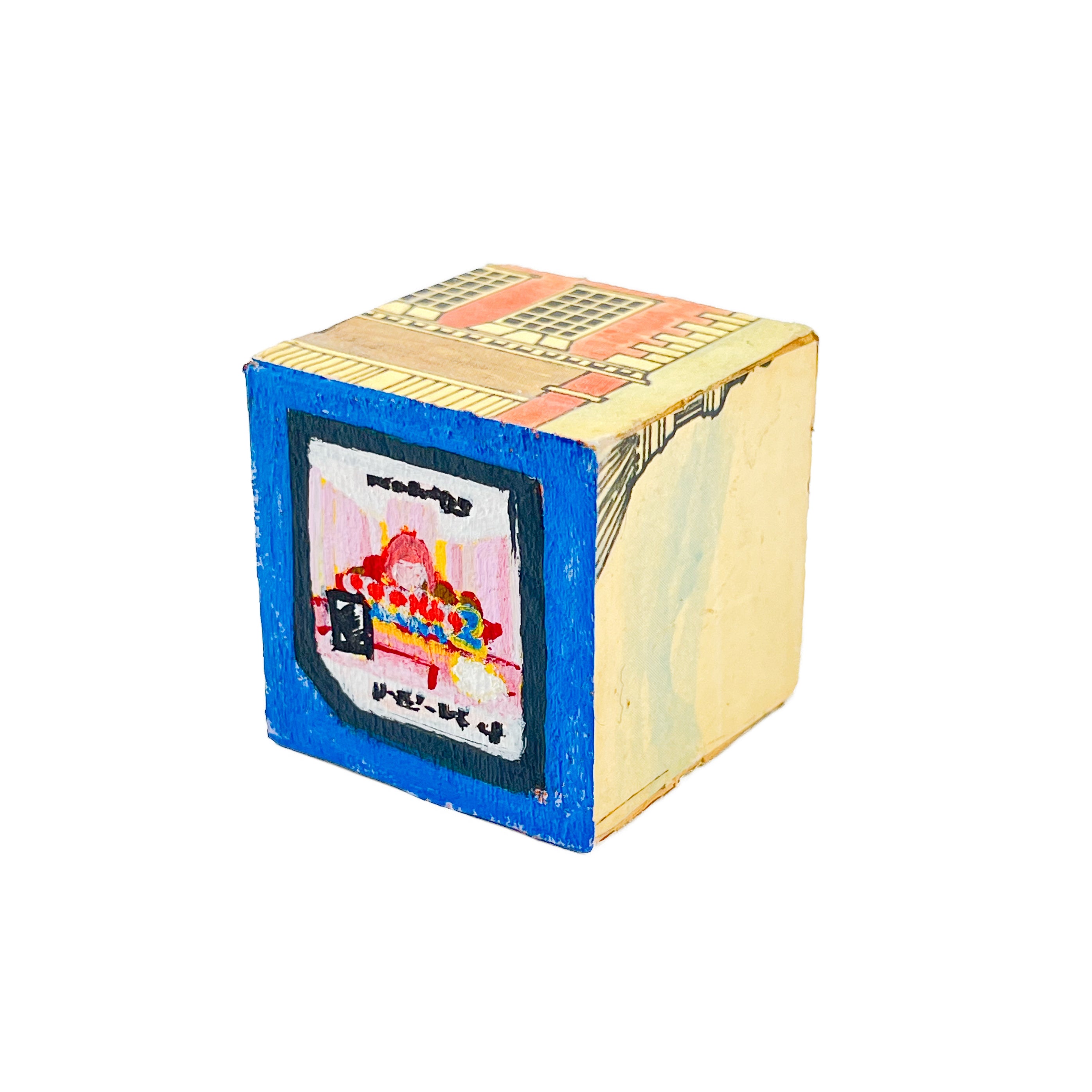 I found used ABC blocks from a thrift store and painted one side each to show at Tiny Gallery St. Johns in Portland, Oregon in February 2025. This first round of toy blocks have images of video game cartridges, power outlet faces, and various microchips. Modern toys are typically electronic, and it seems most kids would rather play with video games than these toy blocks they are shown on.