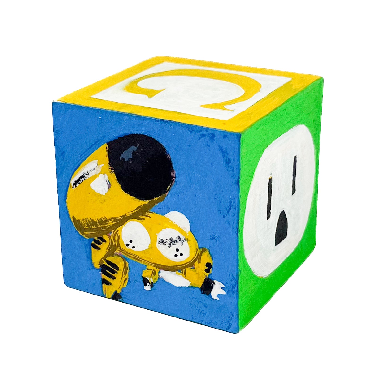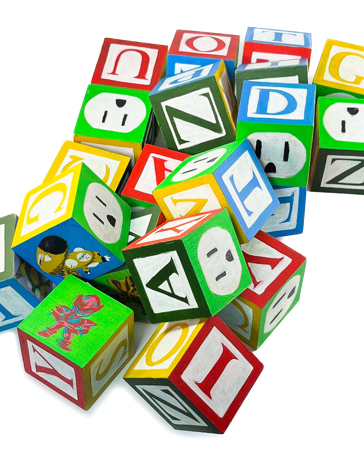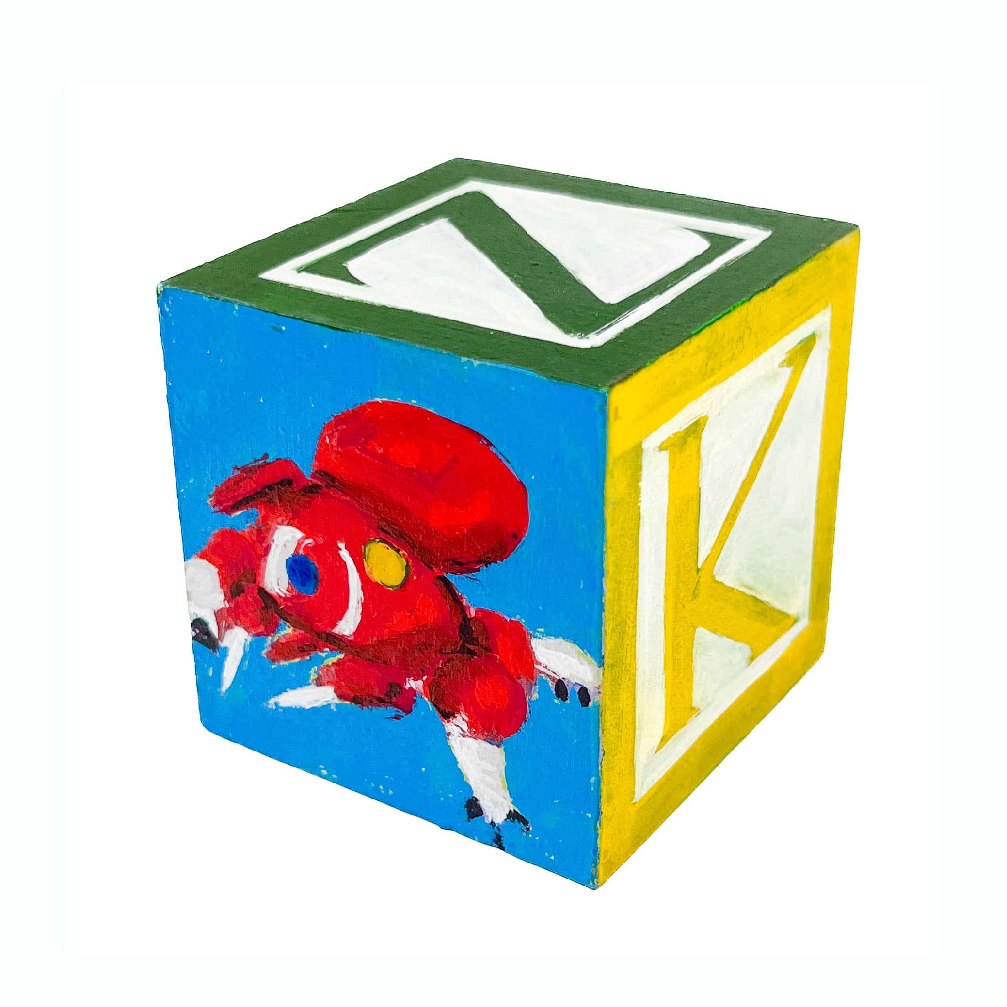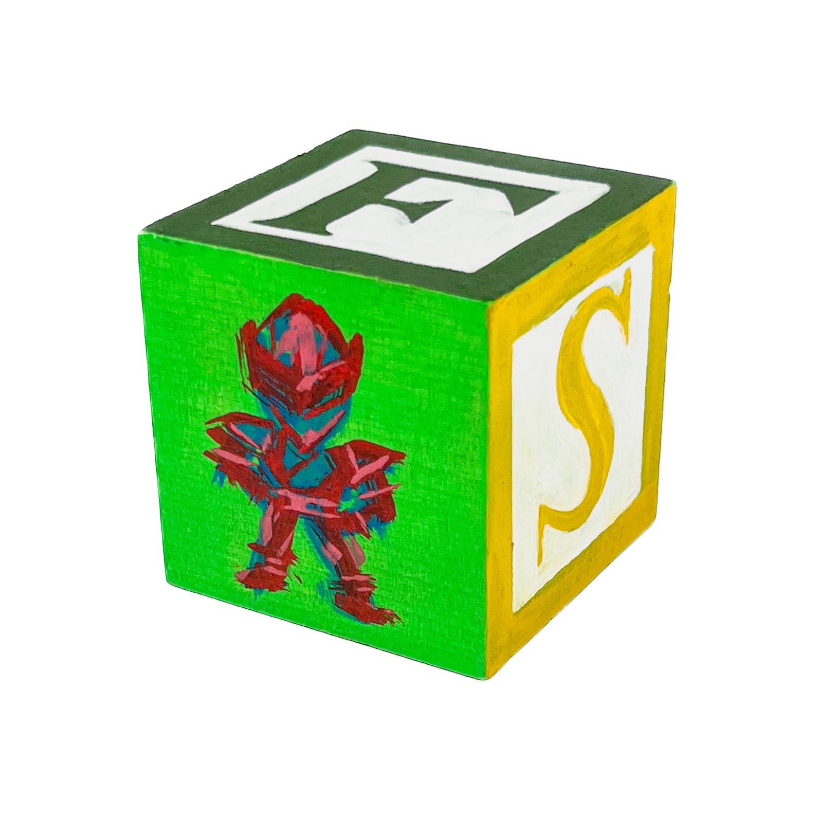 These small painted blocks were born out of the challenge to create tiny artworks - under 3" x 3". Since I've been painting a lot of toys lately, I had the idea to use children's ABC blocks as my painting surface, and create a kind of art-toy.
