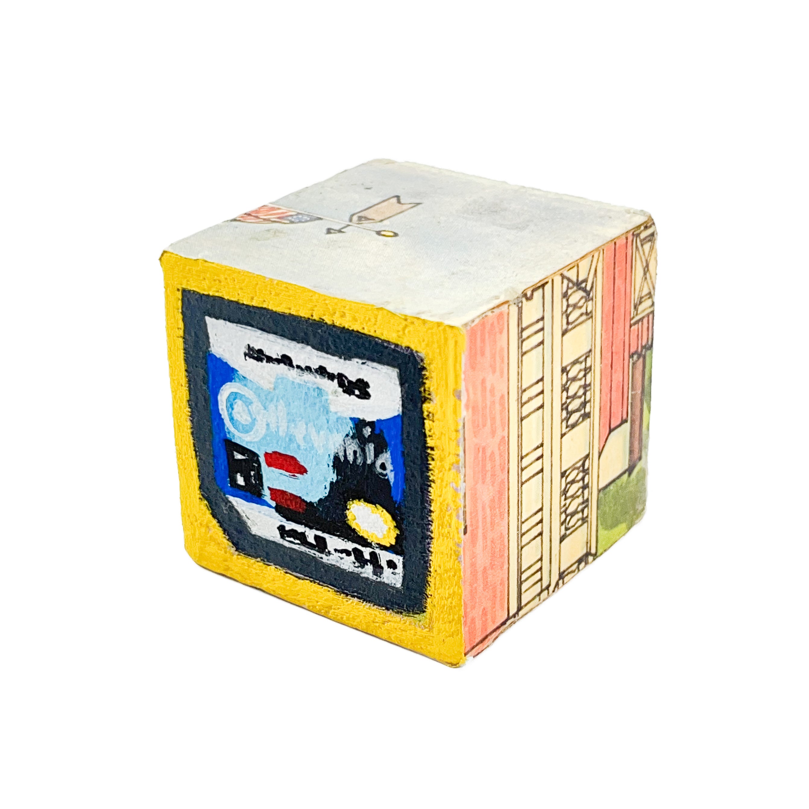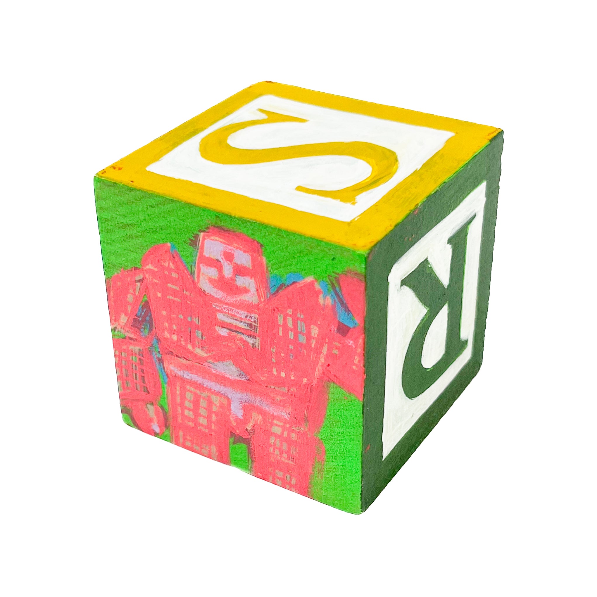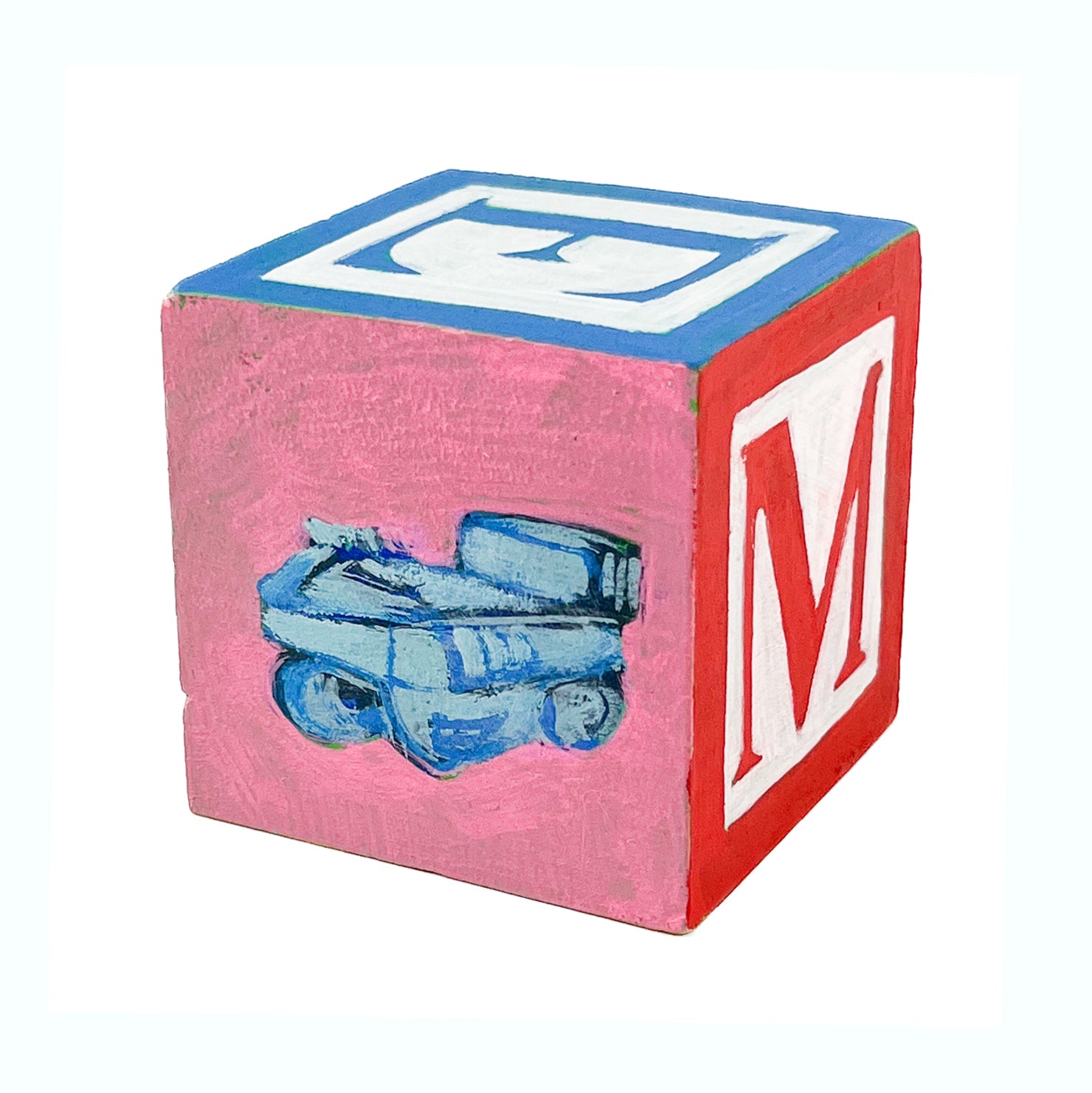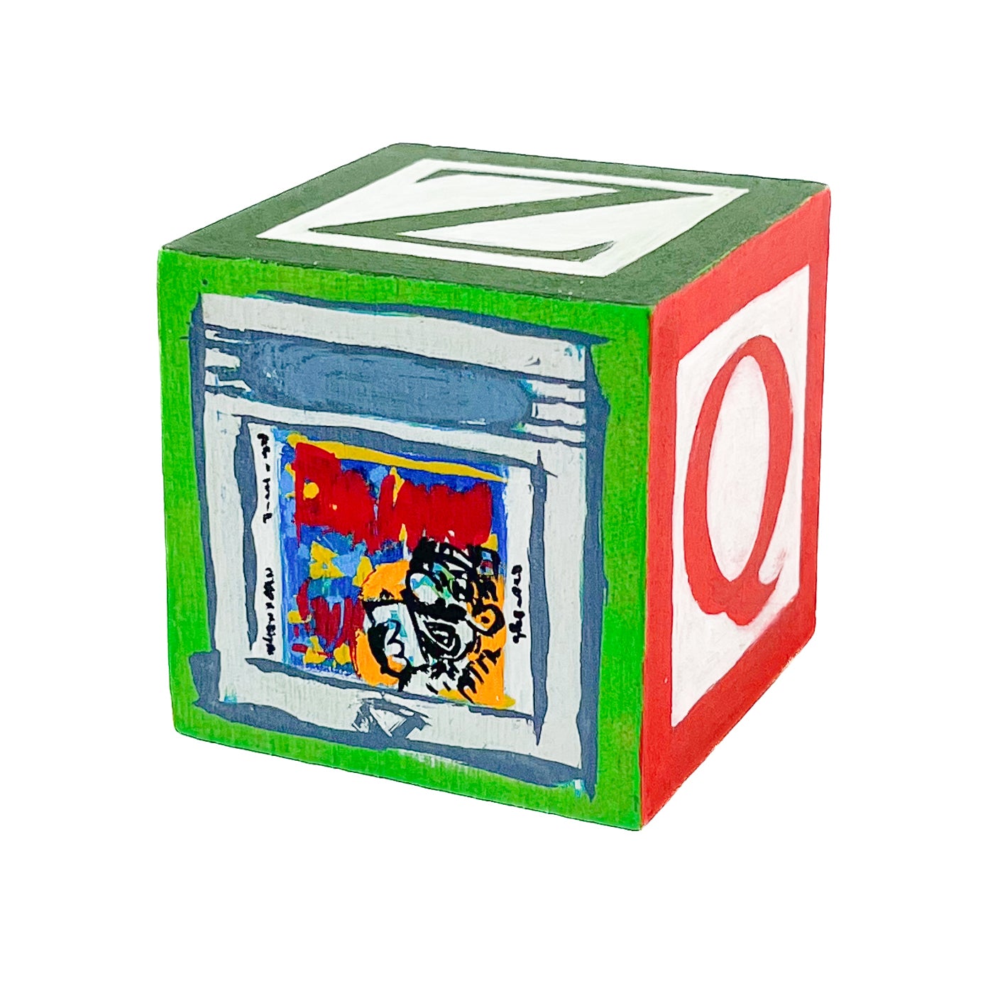 These small painted blocks were born out of the challenge to create tiny artworks - under 3" x 3". Since I've been painting a lot of toys lately, I had the idea to use children's ABC blocks as my painting surface, and create a kind of art-toy.
