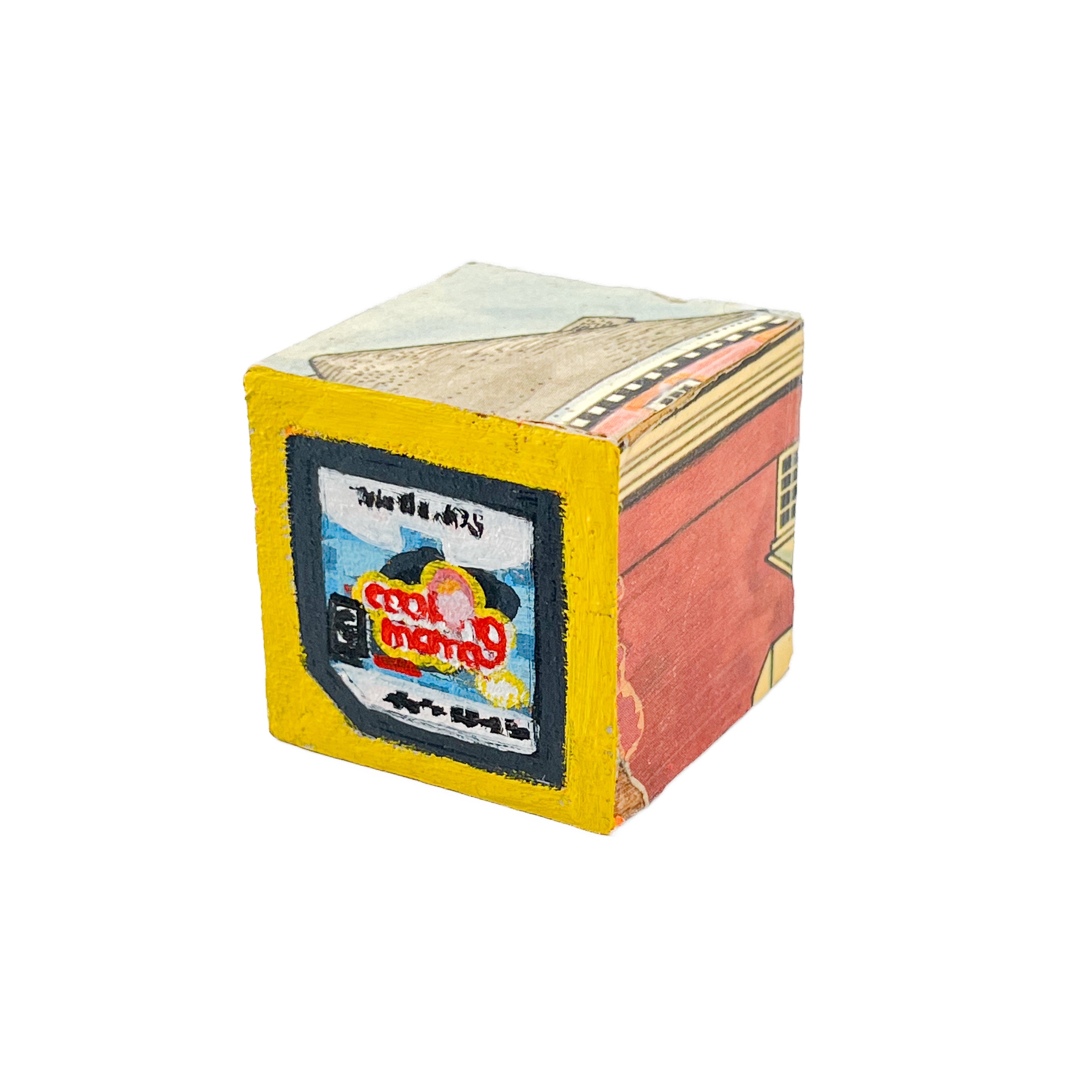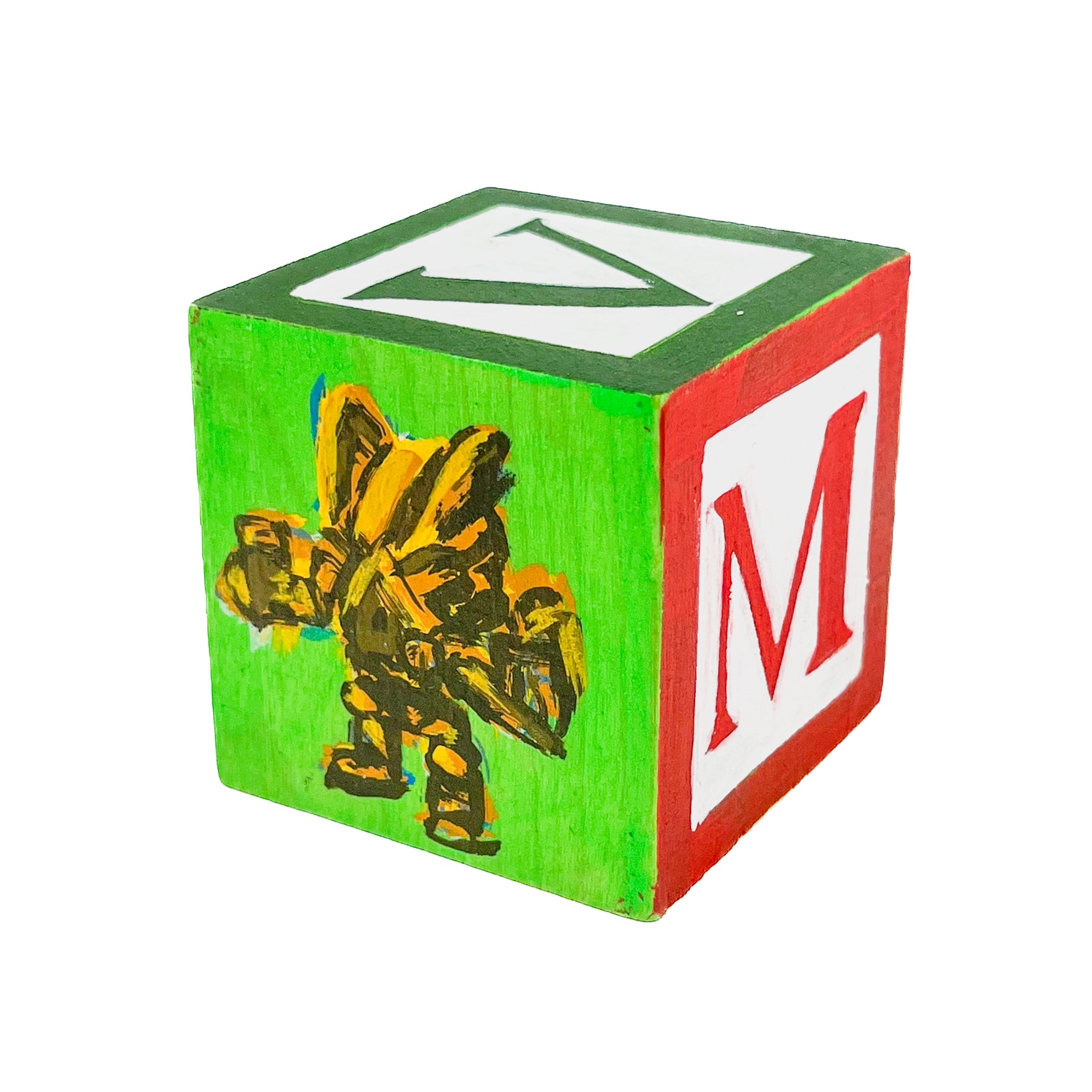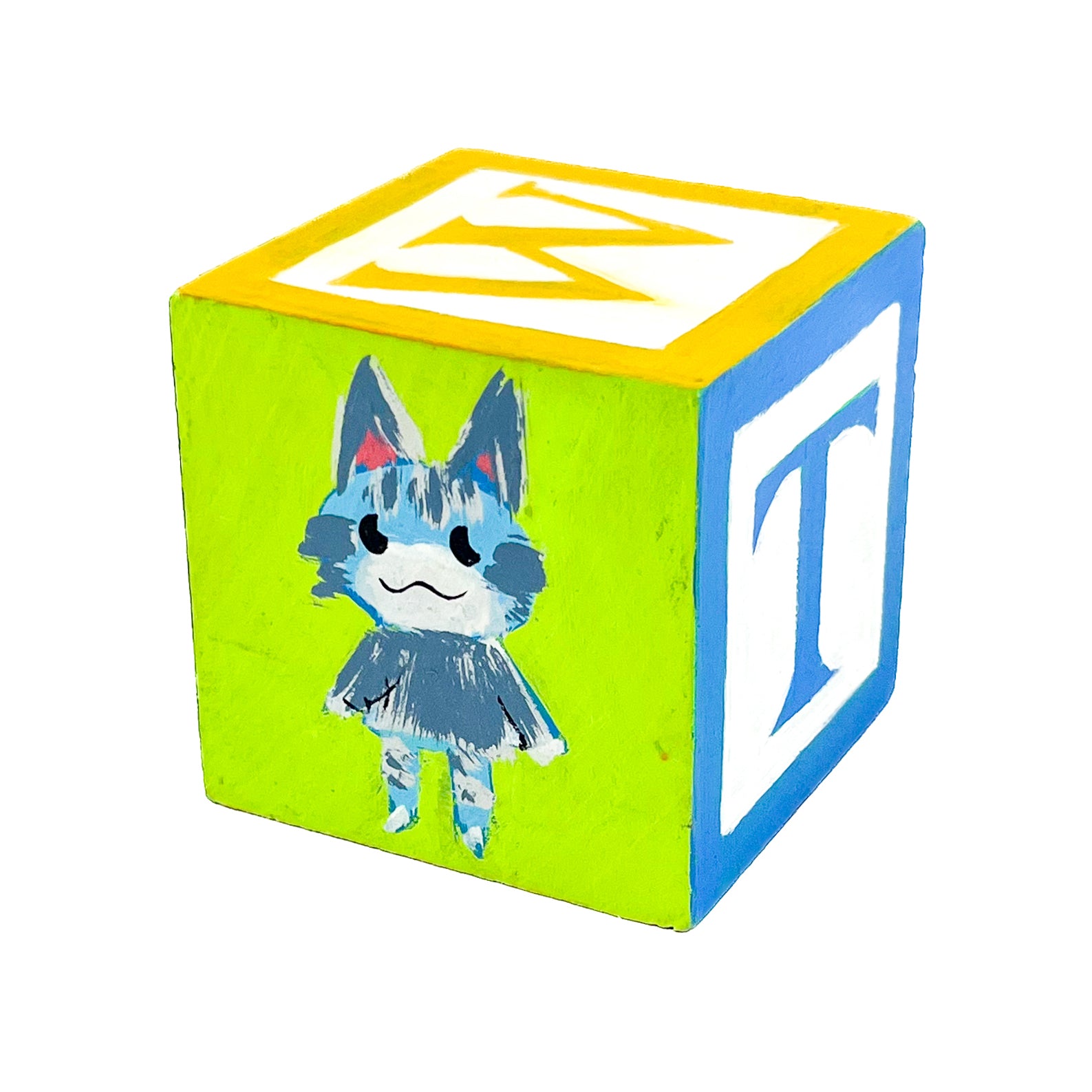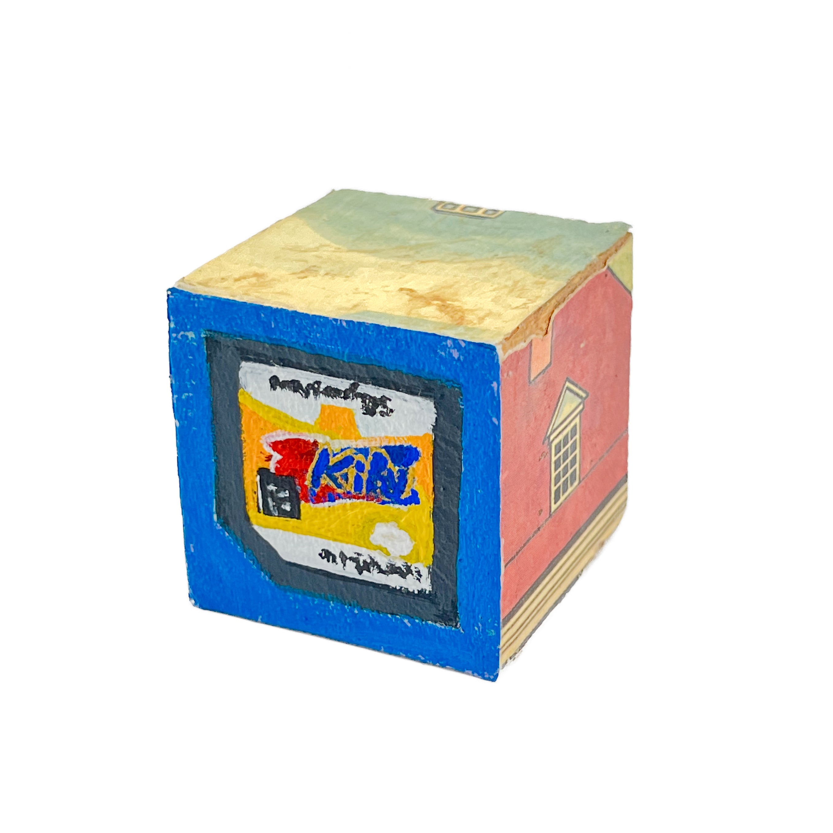 These small painted blocks were born out of the challenge to create tiny artworks - under 3" x 3". Since I've been painting a lot of toys lately, I had the idea to use children's ABC blocks as my painting surface, and create a kind of art-toy.